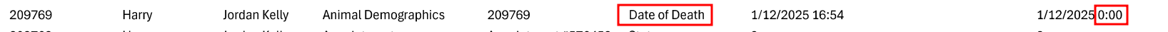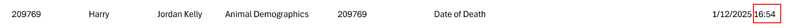 The second is a subsequent "Discharged" entry (two lines further up, chronologically, in the logs document). In professional veterinary software, a file is closed in one of two ways: a "Deceased" status OR a "Discharge" status. These are mutually exclusive. At 4.54pm, the system recorded the back-dated death entry. Yet, later, a human actor manually added the text "Discharged By:" to the file.