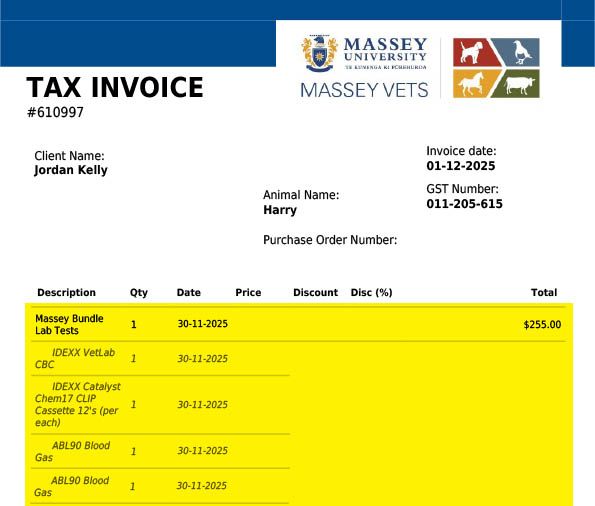 The most damning evidence of clinical malpractice is not just what was administered, but when. The invoice proves that on November 30th—the night of Harry’s admission—Massey performed an IDEXX Catalyst Chem17 CLIP and a Massey Bundle Lab Test. These are not "generic" tests; they are high-resolution diagnostic panels specifically designed to evaluate renal (kidney) and hepatic (liver) function.